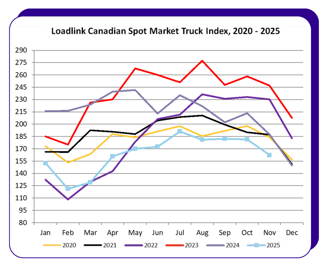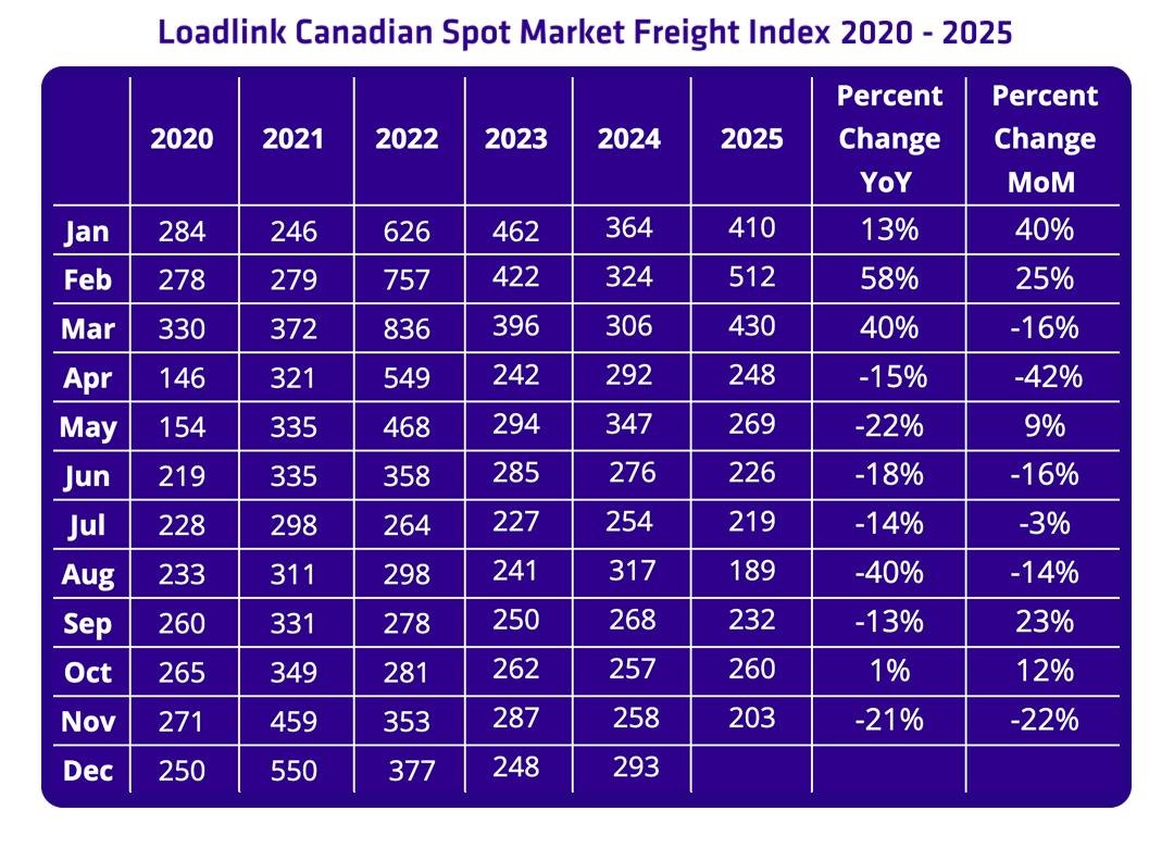 Après la forte dynamique observée plus tôt à l’automne, le mois de novembre a apporté un ralentissement au marché spot canadien, un changement qui a ouvert une fenêtre de planification plus large pour les courtiers et les transporteurs. Dans l’ensemble, les annonces de chargement sur Loadlink ont diminué de 22 % par rapport à octobre et de 20 % par rapport à l’année précédente, ramenant l’activité à un niveau plus stable et plus durable.